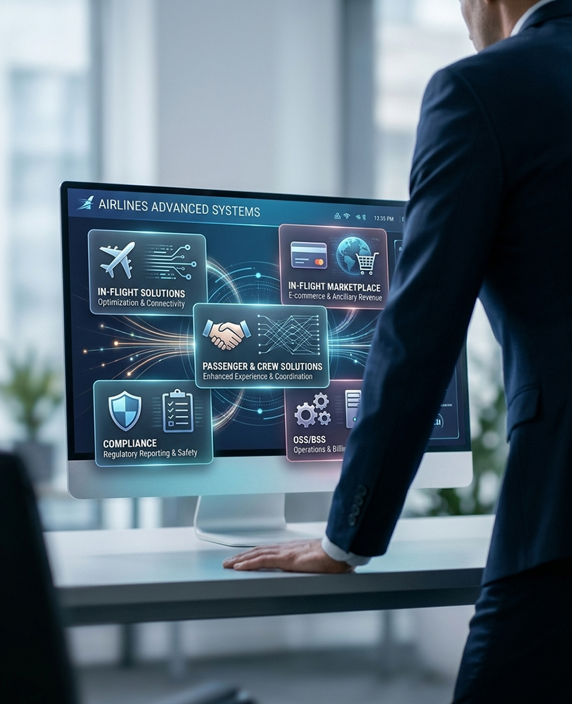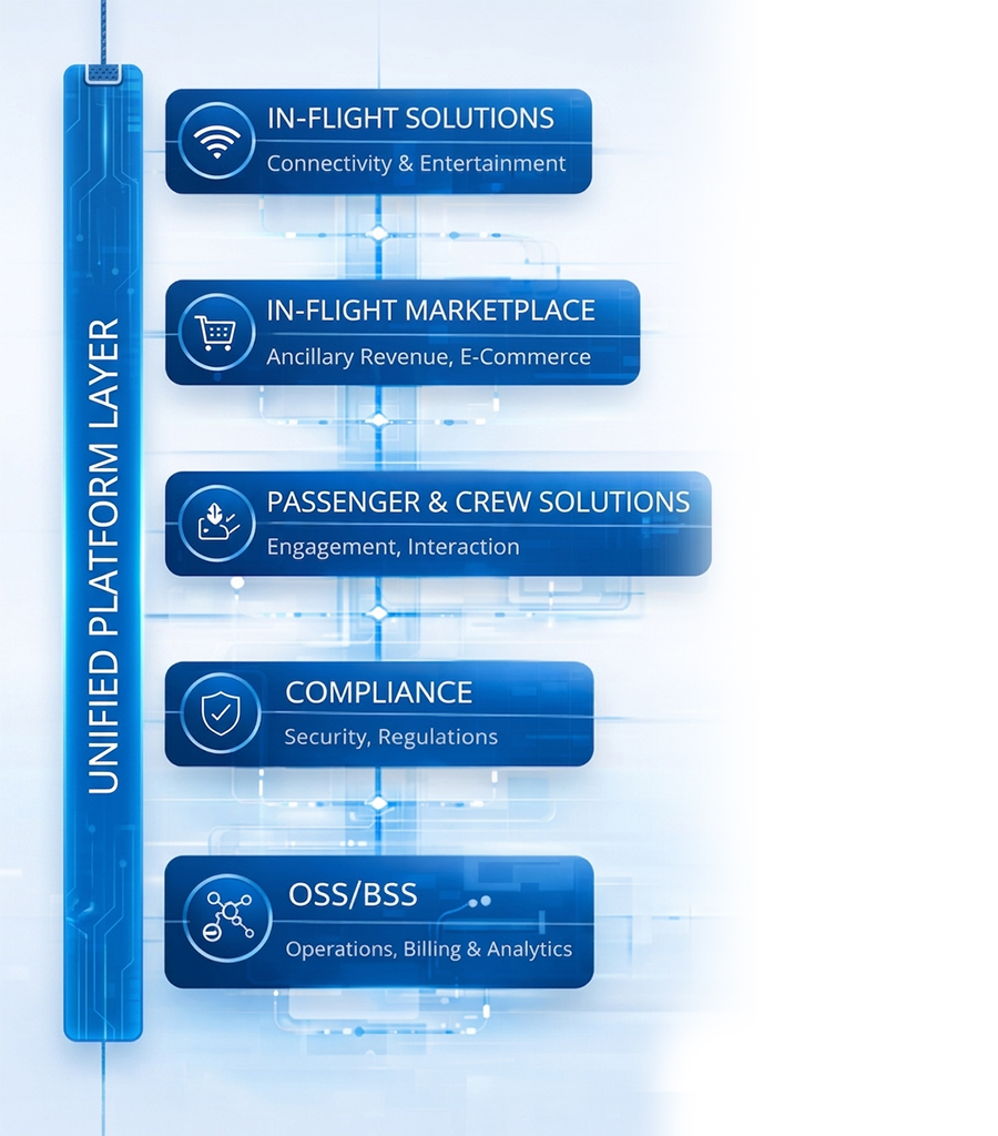 Deliver passenger services, onboard connectivity, digital commerce, crew workflows, telecom-grade OSS/BSS, and compliance through an integrated aviation solution stack.