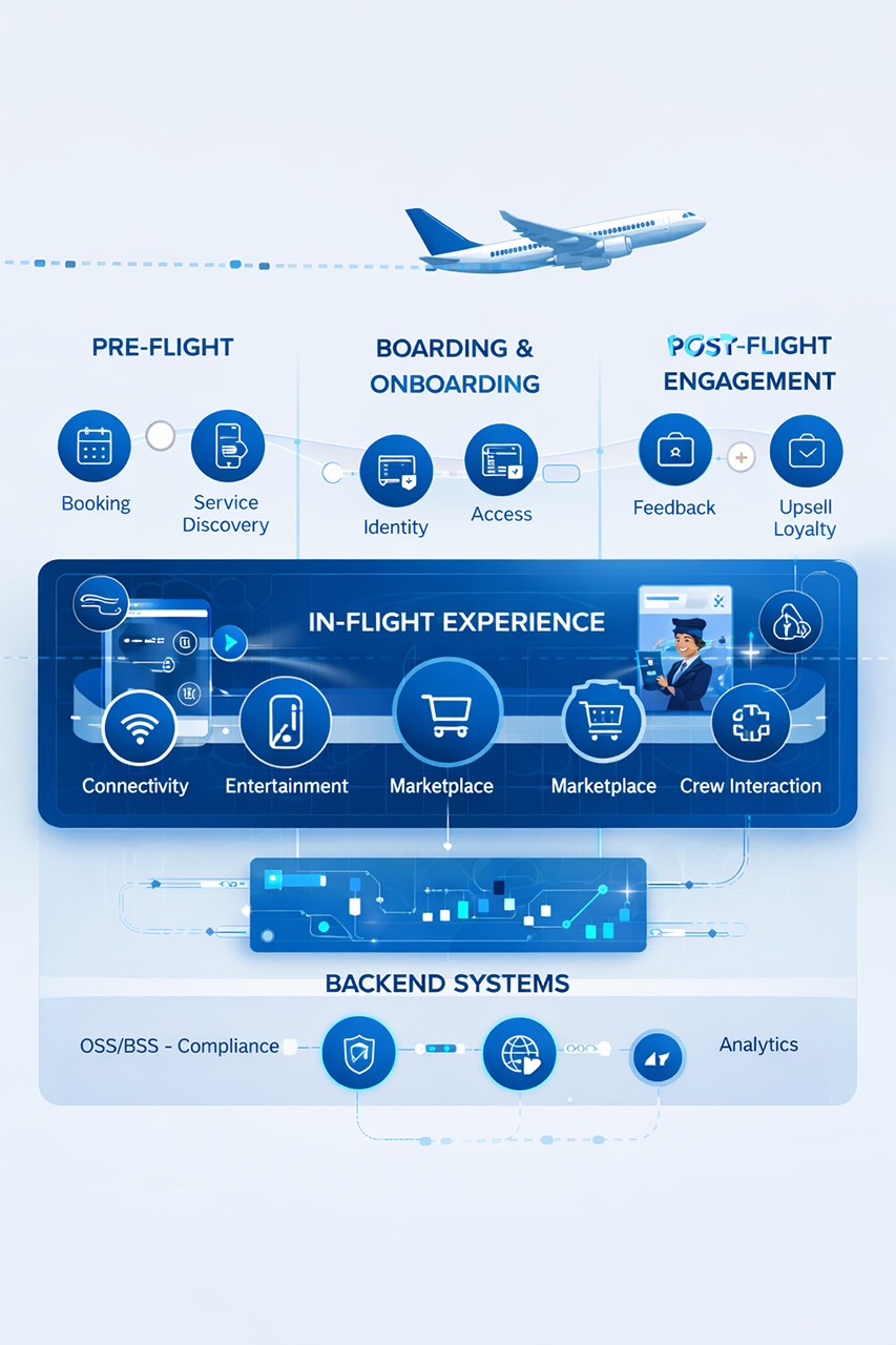 By integrating passenger experiences, commerce platforms, connectivity services, and backend OSS/BSS systems, we help airlines and aviation connectivity providers deliver consistent, real-time, and monetizable digital interactions across every stage of the journey.
